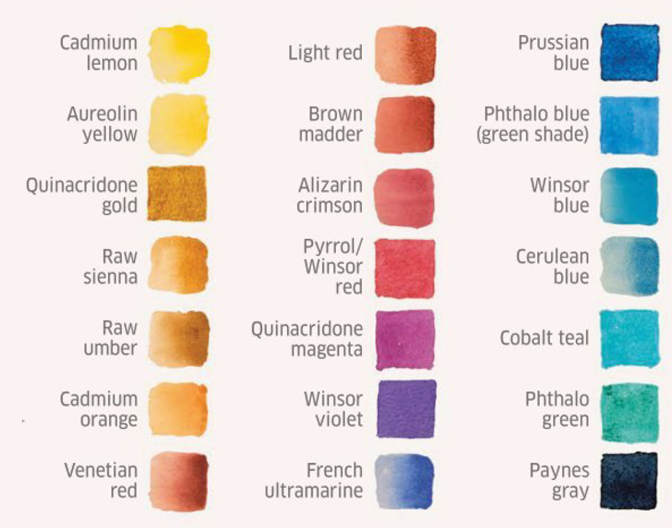 A basic watercolor palette. Source: Dorling Kindersley, Artist’s Painting Techniques: Step-By-Step Workshops from professional artists, DK, New York, 2016.